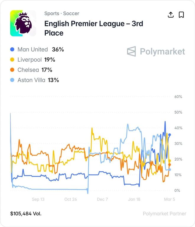 根据「PolymarketSport」的分析研究,曼联仍然是本赛季拿到英超第三名的最大热门,有36%的可能性保持目前的排名,第二热门利物浦的几率只有19%,目前与红魔同分的维拉则才13%。但曼联超越前方对手曼城的可能性也很低,瓜迪奥拉的球队跌至第三的机会仅有9%。